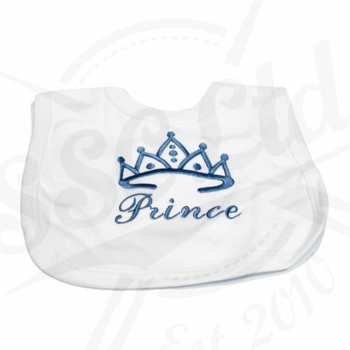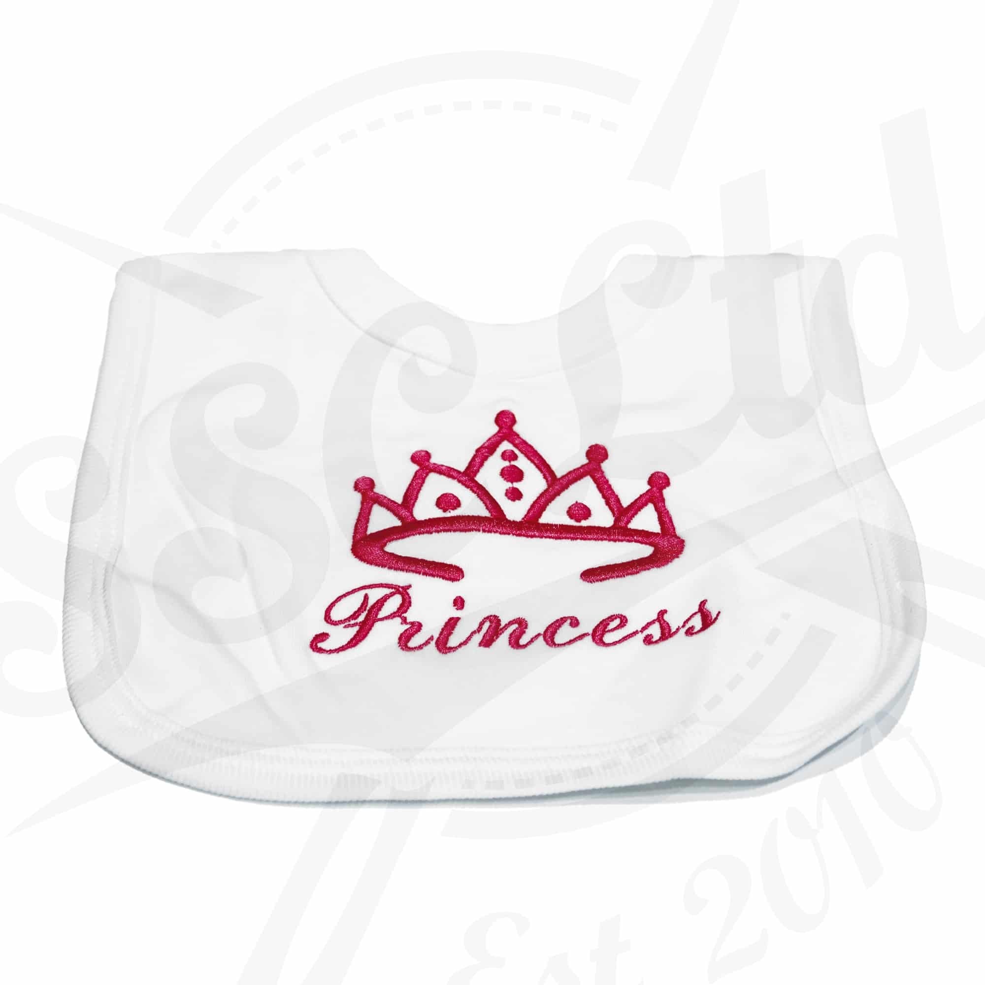 Premium quality double layered 100% cotton pullover bibs for babies. Choose from three different bib colours and matching thread colour; this design reads “Princess”.